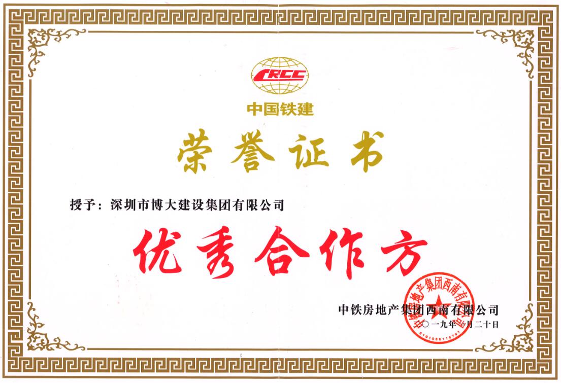 博大建設集團以優秀的工程質量和準時交期,協助中國鐵建奠定了西派國樾精裝大平層的品牌效應,榮獲中國鐵建優秀合作方。