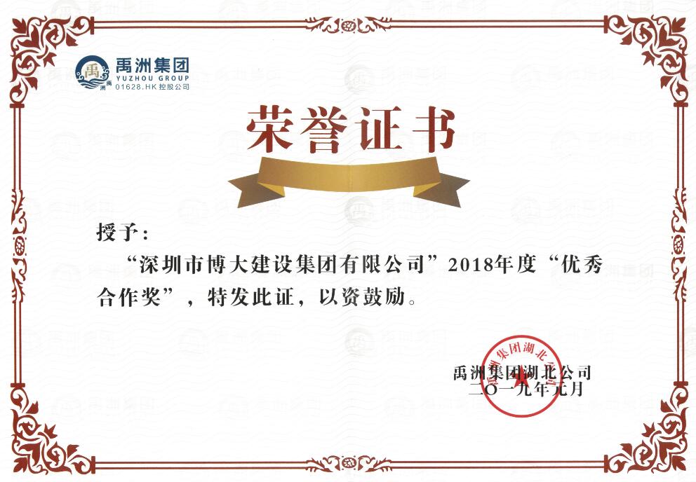 博大建設集團承建了禹洲集團湖北公司武漢賽洛城六期的精裝房工程,在武漢百盤維權的背景下,博大負責的精裝房一次性交房率達到98.41%,且工程質量優秀,幫助客戶成功避免了因交期、裝修質量而造成的消費者維權風波。博大的綜合實力和用心服務贏得禹洲集團湖北公司的高度認可,榮獲2018年度優秀合作獎。