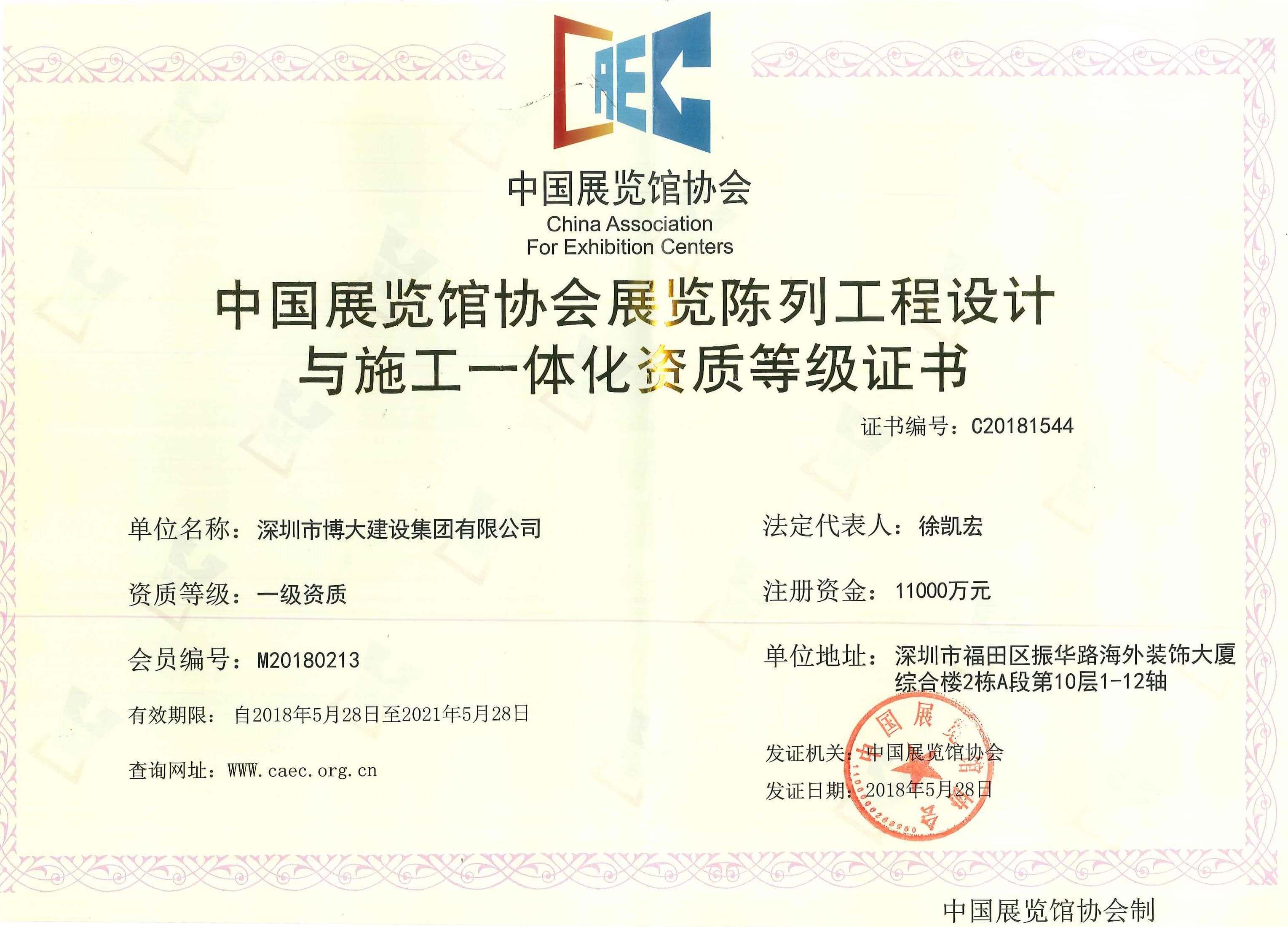 博大建設集團作為行業最具發展活力的企業,近年來以迅猛的成長速度,得到了越來越多的關注和認可。在各級領導的關懷和全體家人的共同努力下,集團資質建設取得新的進展:獲得展覽工程企業一級資質,展覽陳列工程設計與施工一體化一級資質。