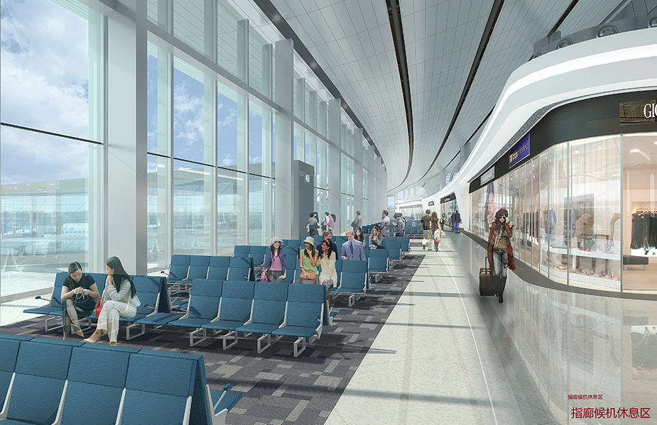 北京大興國際機場航站樓形如展翅的鳳凰,五指廊的造型完全以旅客為中心。整個航站樓有82個登機口,但是旅客從航站樓中心步行到達任何一個登機口,所需的時間不超過8分鐘。博大建設(shè)集團承建了中南指廊國際出發(fā)到達區(qū)域室內(nèi)裝飾工程。